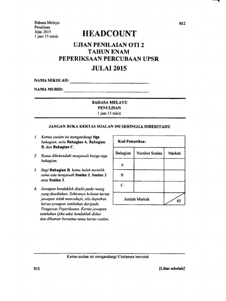 Contoh Muka Depan Kertas Soalan Peperiksaan Bahasa Melayu Upsr
